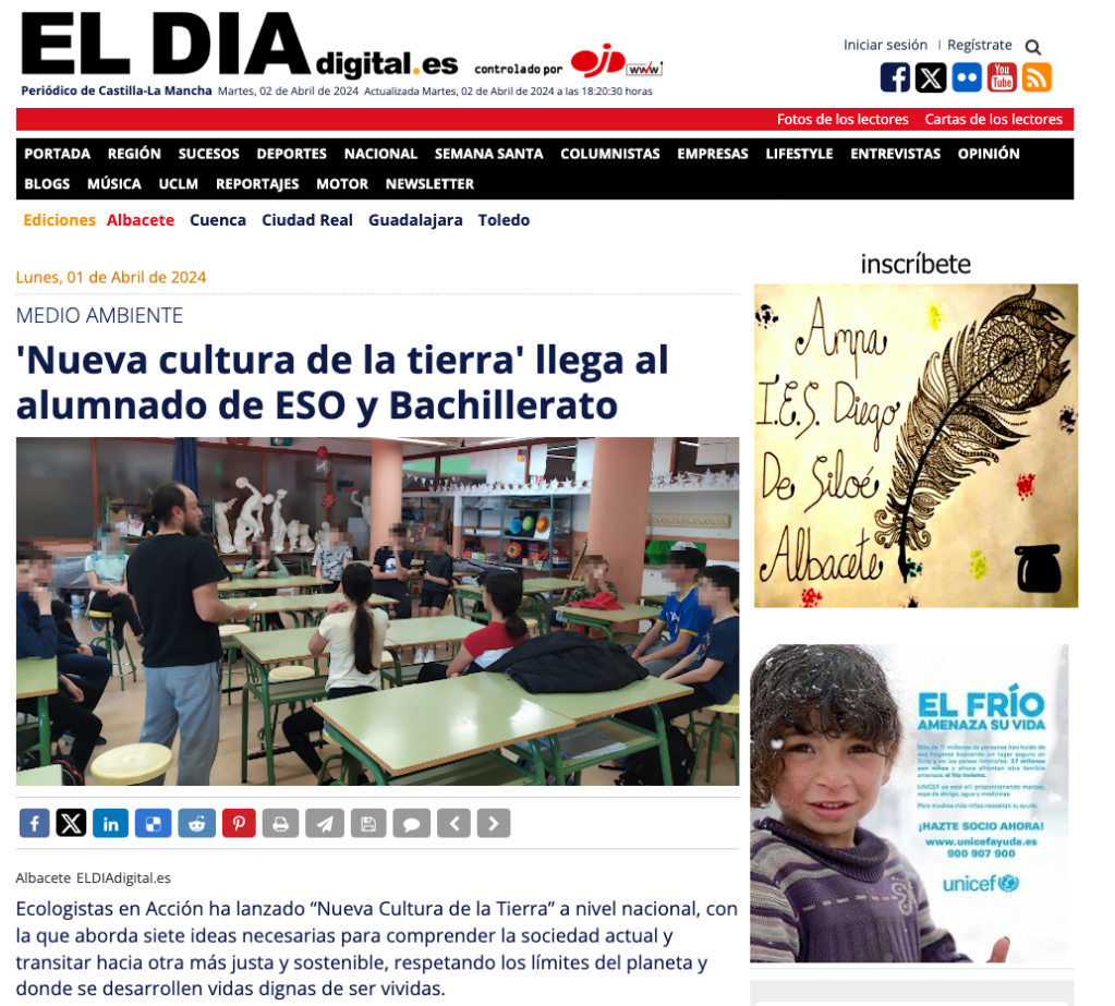 La formación, promovida por el AMPA se denomina “Nueva Cultura de la Tierra”, y nuestro centro Diego de Siloé ha sido el primer instituto de Castilla la Mancha en el que se ha impartido.