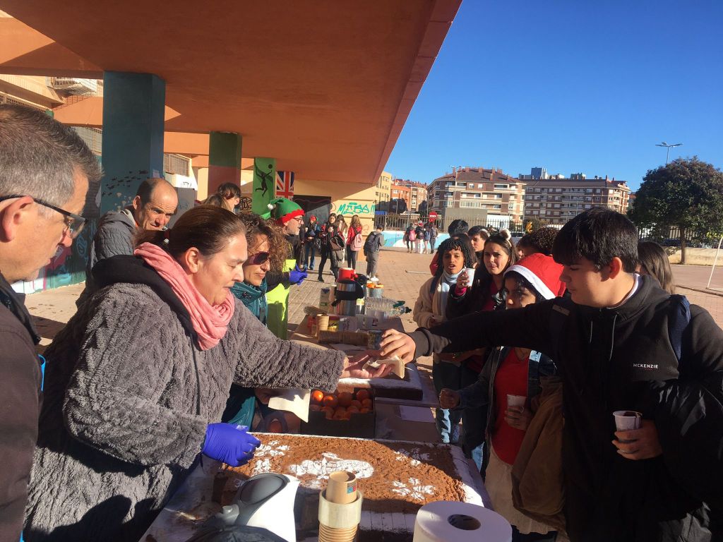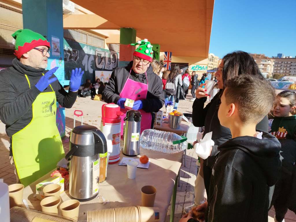 La mañana soleada nos ha permitido disfrutar de la participación de muchos alumnos y profesores, que junto con muchos padres, han dado buena cuenta de los bizcochos allí ofrecidos, junto con infusiones, y mandarinas, para reforzar la vitamina C, y los hábitos saludables.