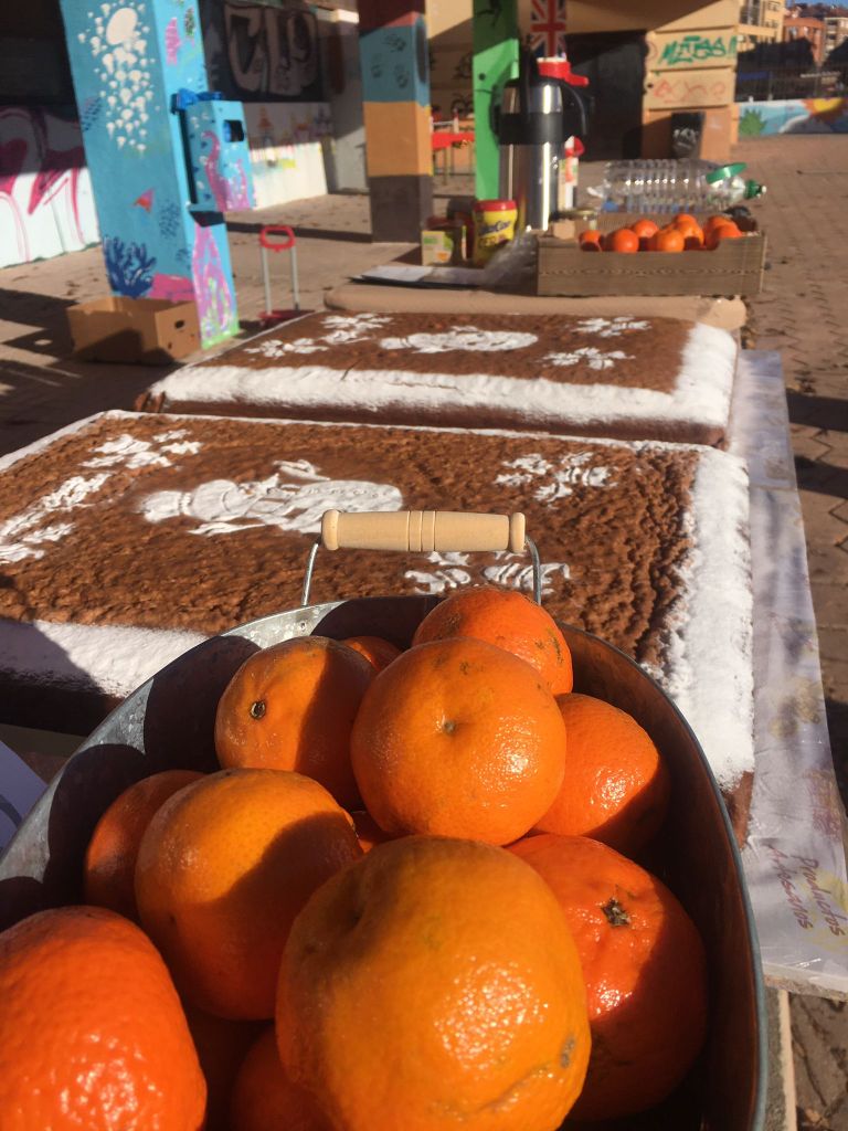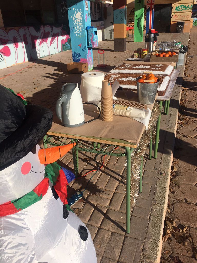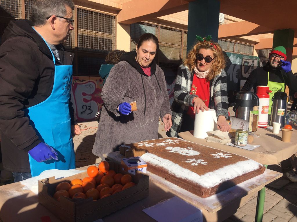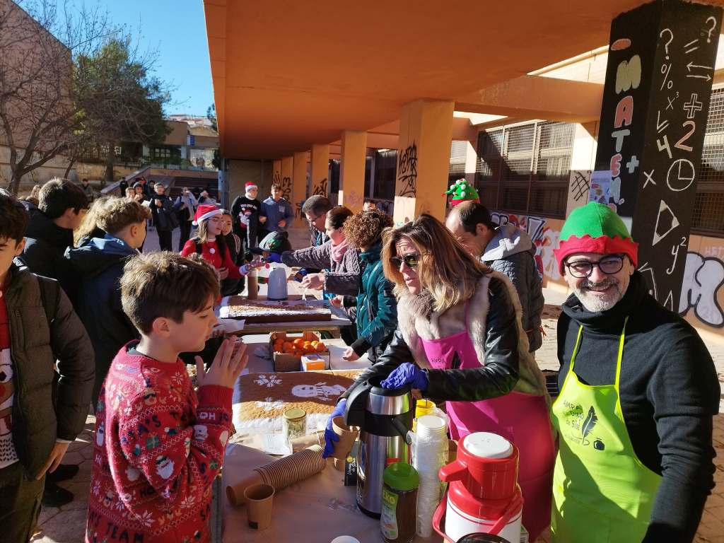 Hemos querido aprovechar la celebración del último día del curso ,para ofrecer un almuerzo saludable y navideño, compartiendo con alumnado, padres, madres y profesorado dos grandes bizcochos de harina de tritordeum, elaborados artesanalmente por la reconocida Panadería Sahuquillo, acompañados de fruta de temporada e infusiones ecológicas.